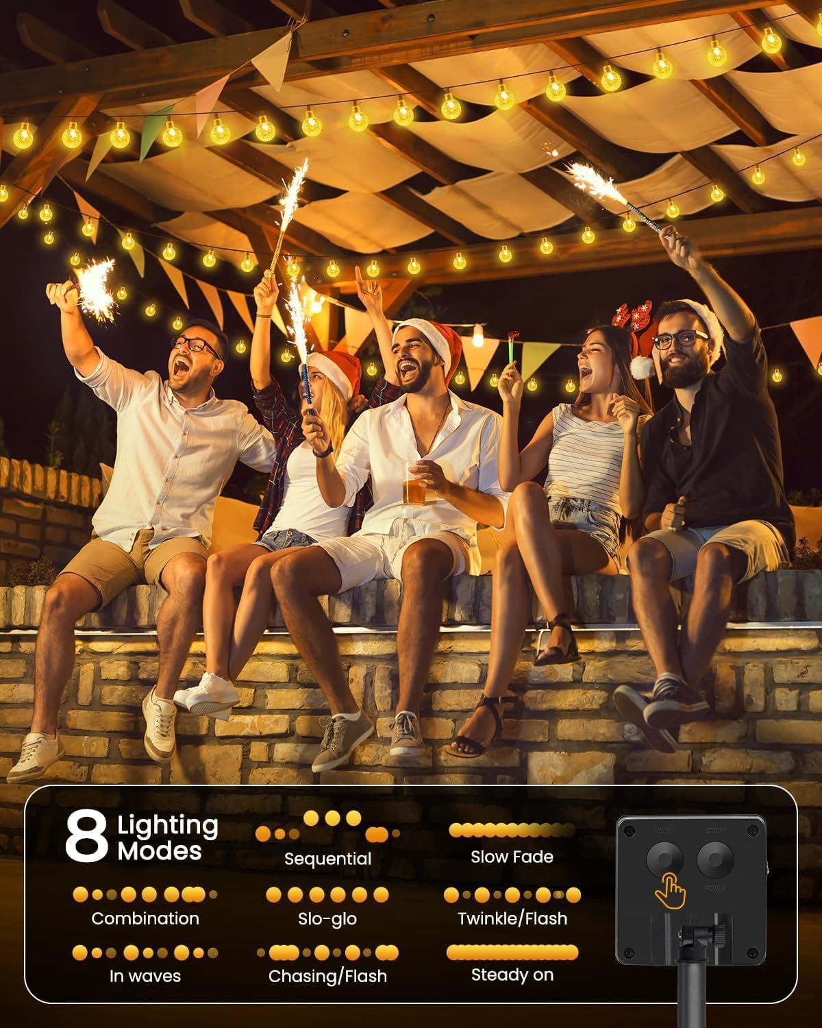 The solar globe string lights with built-in memory chip save your last modes setting and no need to reset mode every day; Perfect decoration for terrace, pergola, bistro, backyard, deck, patio, garden, Christmas, holiday, wedding, party and other celebration occasions.